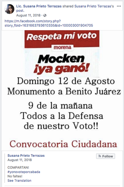 La abogada laboral y activista morenista Susana Prieto, quien hizo campaña por el candidato pro-maquiladoras de Morena Javier González Mocken en las elecciones municipales de Ciudad Juárez en 2018, instó a los trabajadores a confiar en el Gobierno de AMLO. “Súper Mocken” se reunió con los propietarios de las maquiladoras en junio de 2018 y dijo que quería "hacer compromisos con los corporativos de ustedes", y agregó: "Les pido se constituyan en parte del Gobierno municipal, si el voto nos favorece".